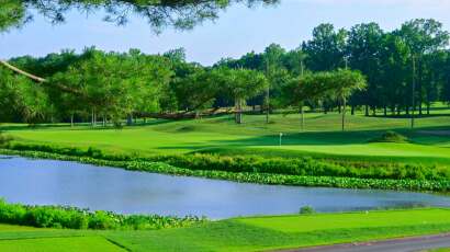 Hole 10 sets the scene for many spectacular holes on the back side where water comes into play. This downhill par 4 can play long and present varied approach shots to one of the largest greens on the course. Beautiful pathways lead you into the low-lying marsh areas of the property exhibiting the many natural enhancements made to the course throughout the extensive stream restoration project.